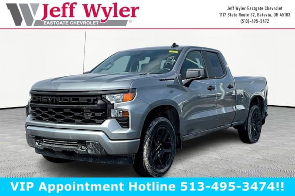 Priced below KBB Fair Purchase Price! Sterling Gray Metallic 2026 Chevrolet Silverado 1500 Custom 2.7L I4 Turbocharged DOHC 16V LEV3-SULEV30 310hp 4WD 8-Speed Automatic 17/21 City/Highway MPG Jeff Wyler Eastgate Auto Mall is pumped up to offer this outstanding-looking 2026 Chevrolet Silverado 1500 Custom in Sterling Gray Metallic. Well equipped with: Custom Convenience Package (Electric Rear-Window Defogger, EZ Lift Power Lock and Release Tailgate, LED Cargo Area Lighting, Remote Vehicle Starter System, and Theft Deterrent System (unauthorized Entry)), Custom Value Package, Dark Essentials Package (Black Name Plates, Black Tailgate CHEVROLET Lettering, and Front Black Bowtie Emblem), High Capacity Suspension Package, Preferred Equipment Group 1CX (10-Way Power Driver Seat with Lumbar, 120-Volt Bed Mounted Power Outlet, 120-Volt Interior Power Outlet, 3.5 Monochromatic Display Driver Info Center, 40/20/40 Front Split-Bench Seat, Bluetooth® For Phone, Cloth Seat Trim, Color-Keyed Carpeting Floor Covering, Deep-Tinted Glass, Dual Rear USB Ports (charge Only), Electronic Cruise Control, Front Frame-Mounted Black Recovery Hooks, Front Rubberized Vinyl Floor Mats, HD Rear Vision Camera, Manual Tilt Wheel Steering Column, OnStar Services Capable, Power Front Windows with Driver Express Up/Down, Power Front Windows with Passenger Express Down, Power Rear Windows with Express Down, Rear 60/40 Folding Bench Seat (folds Up), Rear Rubberized-Vinyl Floor Mats, Remote Keyless Entry, SiriusXM Trial Subscription, Standard Tailgate, Teen Driver, Tire Pressure Monitoring System, and Wi-Fi Hot Spot Capable), Trailering Package (Hitch Guidance), 3.42 Rear Axle Ratio, 4-Wheel Disc Brakes, 6 Speakers, 6-Speaker Audio System, ABS brakes, Air Conditioning, All-Weather Floor Liner, Alloy wheels, AM/FM radio: SiriusXM, Apple CarPlay/Android Auto, Auto High-beam Headlights, Automatic Emergency Braking, Brake assist, Bumpers: body-color, Chevytec Spray-on Black Bedliner, Compass, Delay-off headlights, Driver door bin, Driver vanity mirror, Dual front impact airbags, Dual front side impact airbags, Electronic Stability Control, Emergency communication system: OnStar, Following Distance Indicator, Forward Collision Alert, Front anti-roll bar, Front Center Armrest w/Storage, Front Pedestrian Braking, Front reading lights, Front wheel independent suspension, Fully automatic headlights, Heated door mirrors, Illuminated entry, IntelliBeam Automatic High Beam on/Off, Lane Keep Assist with Lane Departure Warning, Low tire pressure warning, Occupant sensing airbag, Outside temperature display, Overhead airbag, Overhead console, Panic alarm, Passenger door bin, Passenger vanity mirror, Power door mirrors, Power driver seat, Power steering, Power windows, Premium audio system: Chevrolet Infotainment 3, Radio data system, Radio: Chevrolet Infotainment 3 System, Rear reading lights, Rear step bumper, Rear window defroster, Remote keyless entry, Security system, Speed control, Speed-sensing steering, Split folding rear seat, Tachometer, Tilt steering wheel, Traction control, Trip computer, Variably intermittent wipers, Voltmeter, Wheels: 20 x 9 Bright Silver Painted Aluminum, and Wheels: 20 x 9 High Gloss Black Painted Aluminum. Price includes: $2000 - Chevrolet Consumer Cash Program. Exp. 04/30/2026