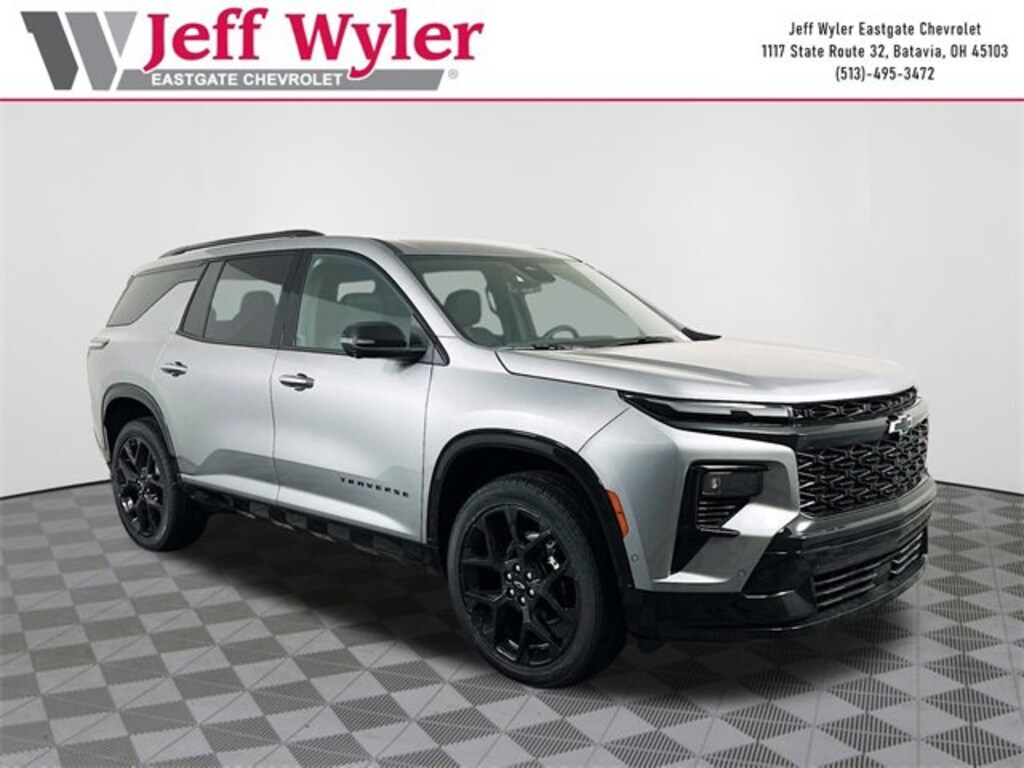 Sterling Gray Metallic 2026 Chevrolet Traverse RS 2.5L DOHC FWD 8-Speed Automatic 20/26 City/Highway MPG Jeff Wyler Eastgate Auto Mall is proud to offer this charming 2026 Chevrolet Traverse RS in Sterling Gray Metallic. Well equipped with: Floor Liner Package (1st and 2nd Row All-Weather Floor Liners, 3rd Row All-Weather Floor Liner, and Integrated Cargo Liner), Preferred Equipment Group 1RS, 12 Speakers, 3rd row seats: split-bench, 4-Wheel Disc Brakes, 6-Way Power Front Passenger Seat Adjuster, 8-Way Power Driver Seat Adjuster, ABS brakes, Air Conditioning, Alloy wheels, AM/FM radio: SiriusXM with 360L, Apple CarPlay/Android Auto, Auto High-beam Headlights, Auto tilt-away steering wheel, Auto-dimming door mirrors, Automatic temperature control, Bose Premium 12-Speaker Audio System Feature, Brake assist, Bumpers: body-color, Child-Seat-Sensing Airbag, Compass, Delay-off headlights, Driver 4-Way Power Lumbar Seat Adjuster, Driver door bin, Driver vanity mirror, Dual front impact airbags, Dual front side impact airbags, Electronic Stability Control, Emergency communication system: OnStar, Exterior Parking Camera Rear, Four wheel independent suspension, Front anti-roll bar, Front Bucket Seats, Front Center Armrest, Front dual zone A/C, Front Passenger 4-Way Power Lumbar Seat Adjuster, Front reading lights, Fully automatic headlights, Garage door transmitter, Heated door mirrors, Heated Driver and Front Passenger Seats, Heated front seats, Heated rear seats, Heated steering wheel, Illuminated entry, Low tire pressure warning, Memory seat, Navigation System, Occupant sensing airbag, Outside temperature display, Overhead airbag, Overhead console, Panic alarm, Passenger door bin, Passenger vanity mirror, Perforated Leather-Appointed Seat Trim, Power door mirrors, Power driver seat, Power Liftgate, Power passenger seat, Power steering, Power windows, Radio data system, Radio: : Audio System w/17.7 Diagonal Display, Rain sensing wipers, Rear air conditioning, Rear anti-roll bar, Rear reading lights, Rear window defroster, Rear window wiper, Remote keyless entry, Security system, SiriusXM with 360L Trial Subscription, Speed control, Speed-sensing steering, Spoiler, Sport steering wheel, Steering wheel memory, Steering wheel mounted audio controls, Tachometer, Telescoping steering wheel, Tilt steering wheel, Traction control, Trip computer, Turn signal indicator mirrors, Variably intermittent wipers, Ventilated Driver and Front Passenger Seats, Ventilated front seats, Voltmeter, and Wheels: 22 High Gloss Black Painted Aluminum. 20/26 City/Highway MPG